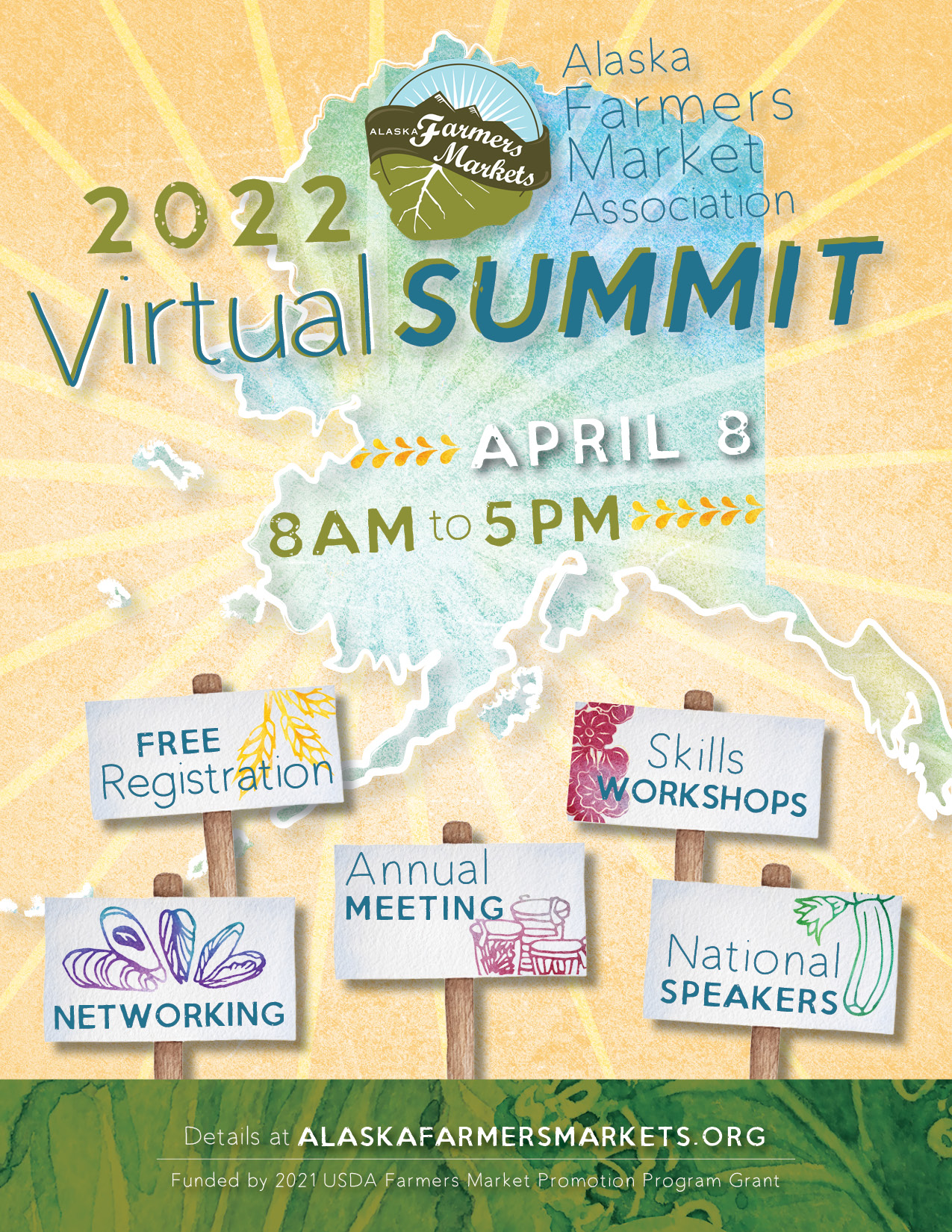 HOMER, Alaska (March 29, 2022) — The Alaska Farmers Markets Association will host its 2022 virtual summit from 8 a.m. to 5 p.m. on Friday, April 8. The theme is “Gather and Grow.” This event is free, but pre-registration is required.