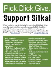In 2017 Alaskans contributed $2.7 million to 668 Alaska nonprofit organizations, and more than $18.5 million has been donated since the program started in 2009. Some Alaskans choose to donate to just one group, while others may spread several donations around to many groups. There now are more than 600 total 501(c)(3) nonprofit organizations participating in Pick.Click.Give. for 2017 (including multi-location nonprofits), including 23 from Sitka. In 2017, Alaskans donated $100,500 to Sitka-based nonprofits.