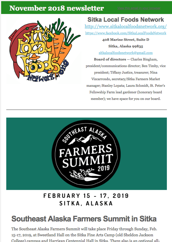 The Sitka Local Foods Network just sent out the April 2019 edition of its monthly newsletter. Feel free to click this link to get a copy.