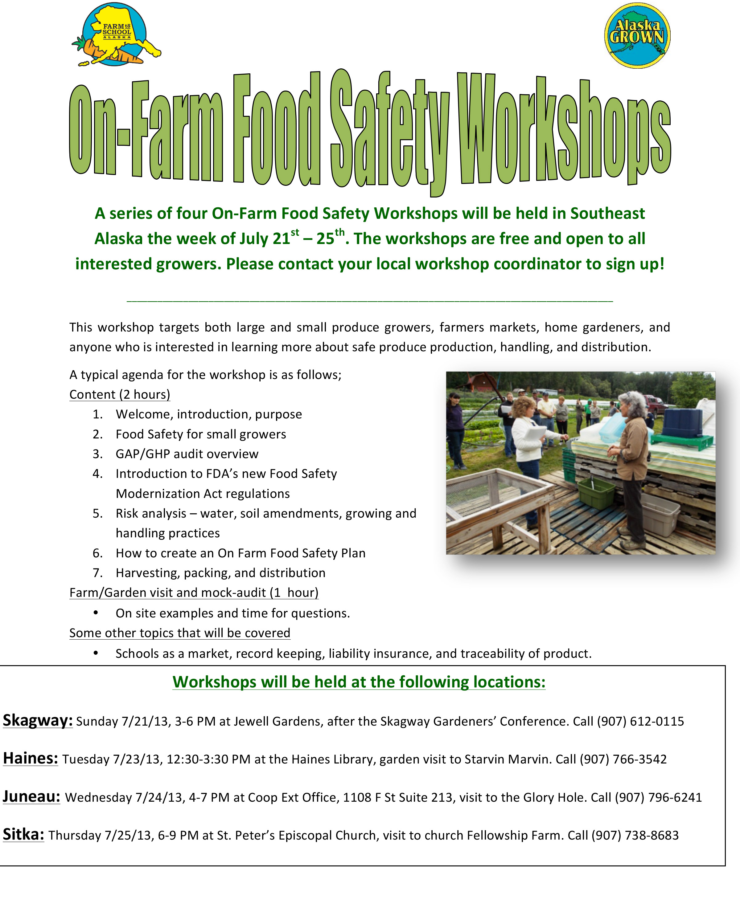 The Alaska Division of Agriculture is planning a series of four On-Farm Food Safety Workshops in Southeast Alaska communities the week of July 21-25. The workshops will be in Skagway, Haines, Juneau and Sitka.