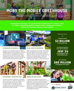 Moby is the size of a tiny house, and it can be pulled behind a pick-up truck. There are six small garden beds inside about waist height (three on each side), plus there are places for hanging baskets. In addition, there are rain gutters to catch rainwater to use in the garden beds. The program’s link includes a handout about Moby and a downloadable curriculum for the teachers to use.