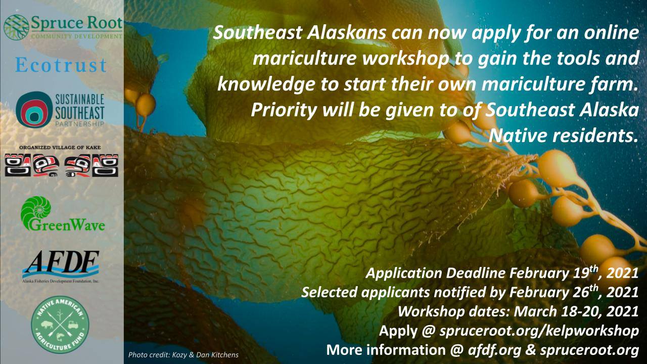 Spruce Root, the Sustainable Southeast Partnership, and other organizations are offering a free, online workshop that will provide tools and training for Alaska Natives in Southeast Alaska interested in starting kelp, oyster, or multi-species ocean farms. The workshop will begin on the evening of Thursday, March 18, and continue with day-long sessions on Friday and Saturday, March 19-20. The workshop will be delivered using Zoom.